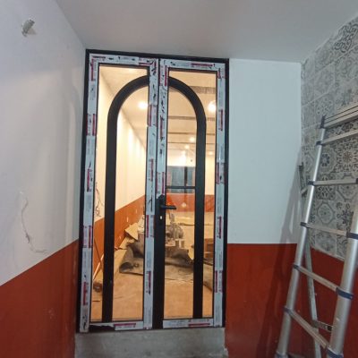 Cửa đi mở quay 2 cánh kết hợp uốn vòm nhôm bên trong