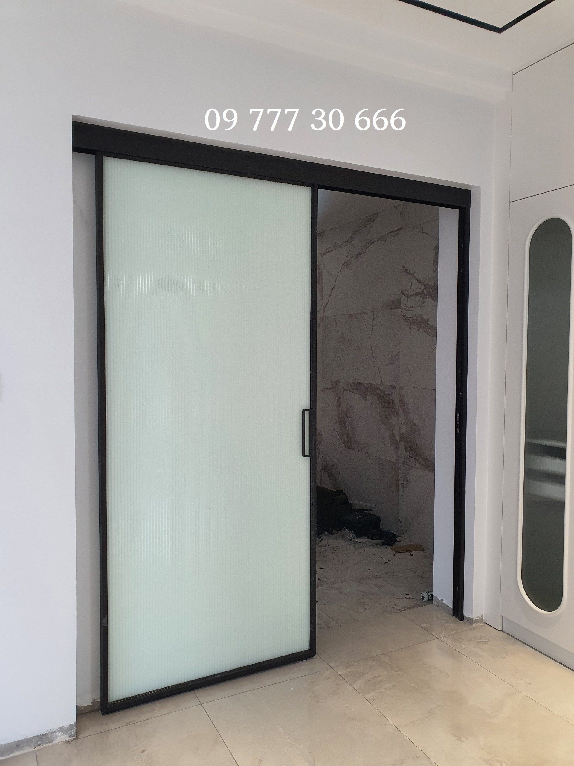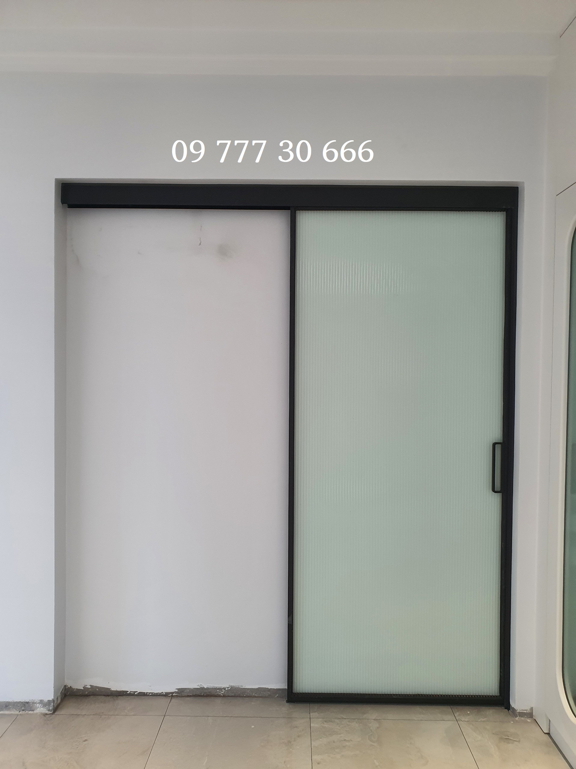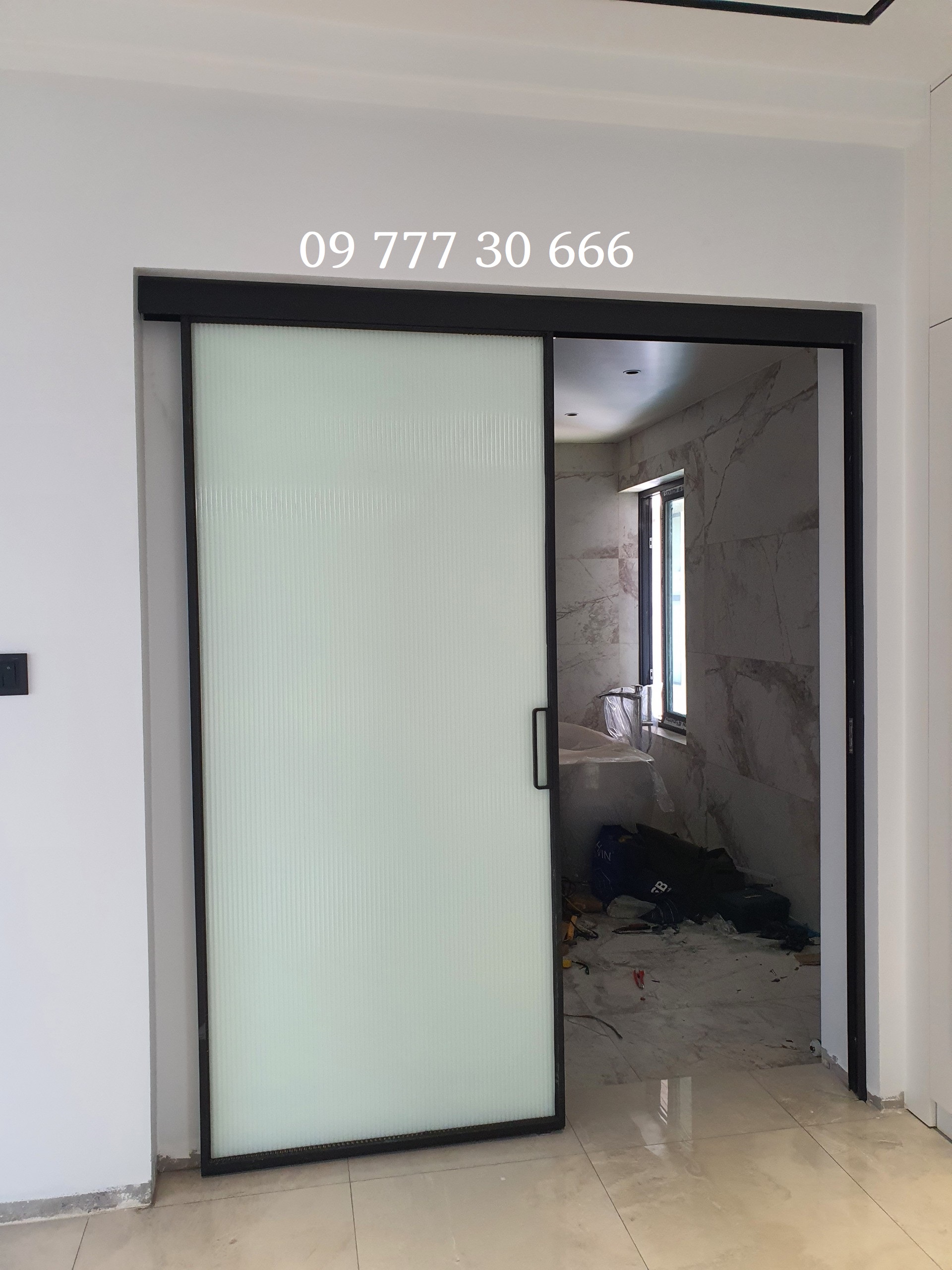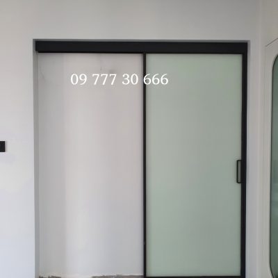 Cửa trượt 1 cánh không ray hệ nhôm Slim, kính trắng đục