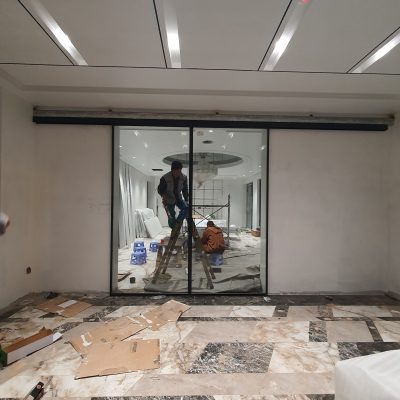 Cửa trượt không ray 2 cánh mở lùa sang 2 bên kính trắng trong