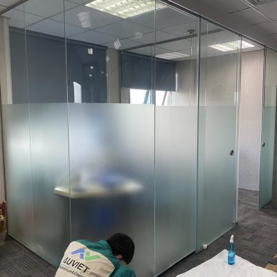Vách kính văn phòng uốn cong kết hợp cửa trượt 2 cánh