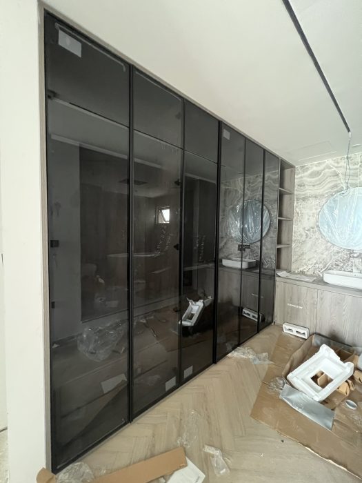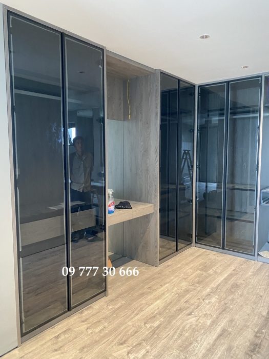 Tủ áo cánh kính hệ nhôm 20×20 kính xám khói hiện đại. Tay dương liền