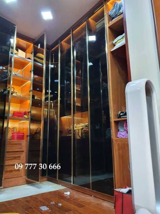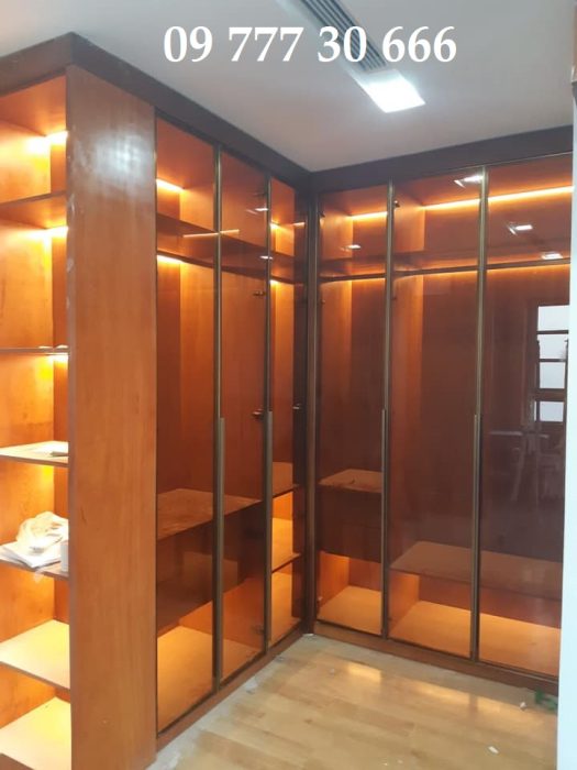 Tủ áo cánh kính màu trà, tay CNC 1100 kết hợp đèn led gắn tủ sáng bừng không gian