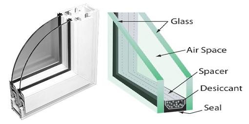 Giữa các lớp kính được ngăn cách bởi thanh đệm nhôm bên trong có chứa hạt hút ẩm.