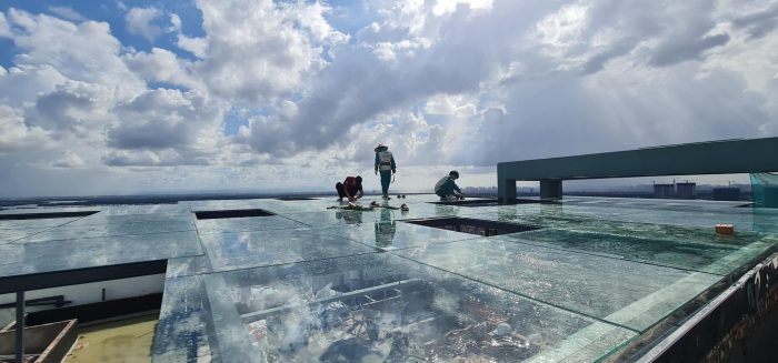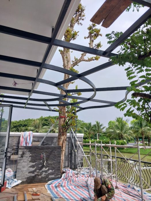 Khung đỡ: được hàn gia cố cẩn thận sử dụng vật liệu thép mạ kẽm, Inox hoặc nhôm hệ. Công đoạn này được làm trước khi đặt kính lên đảm bảo độ phẳng, dốc đều nhau không để tình trạng võng làm đọng nước.